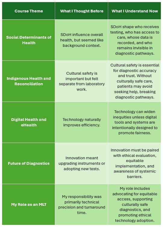 As a Medical Laboratory Technologist (MLT) in Ontario, I am always conscious that every sample I touch is a life, a story, a person waiting for answers. This course has made me understand a difficult truth: Canada has entrenched and longstanding inequities in access to diagnostic testing, which determine who is tested early, who is diagnosed late, and whose results are used to inform clinical decisions.