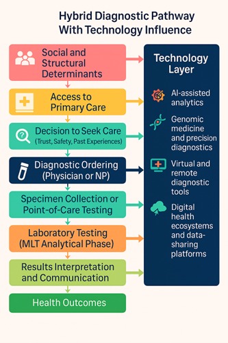 The figure shows how inequalities are nested within each step of the diagnostic pathway, before the first clinical encounter and far beyond the laboratory, and the social and structural determinants shape entry, passage through care and consequences. Technology is a thread that runs throughout, influencing access, quality and outcomes, because together, these determinants co-produce disparities and opportunities for redress along the whole pathway.