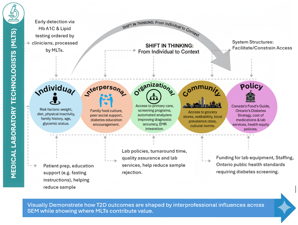 This course changed the way I think about T2D because it showed me how my professional identity and interprofessional practice relate to the information I generate as an MLT. It helped me understand how my role contributes to team-based decision making through timely and accurate diagnostic testing, and it taught me about the evolving definitions of health, policy, and equity, and how system structures facilitate or constrain access to screening, education, and ongoing care for diabetes. By looking at all these levels at the same time, the course helped me shift my thinking from individual behaviour to the context in which people live, work and make choices, therefore I now interpret T2D as a problem that spans individual knowledge and motivation, interpersonal support from family and care teams, organizational practices, community factors, and policy levers that determine coverage, quality standards, and data reporting through the SEM. Consequently, I will apply this integrated approach to guide practical, justice-oriented solutions to the problem of T2D, such as earlier detection through equitable screening pathways, coordinated follow-up based on lab results, and policies that reduce barriers for marginalized groups, and thus the course helped me move toward a multilevel, equity-focused approach to prevention and care.